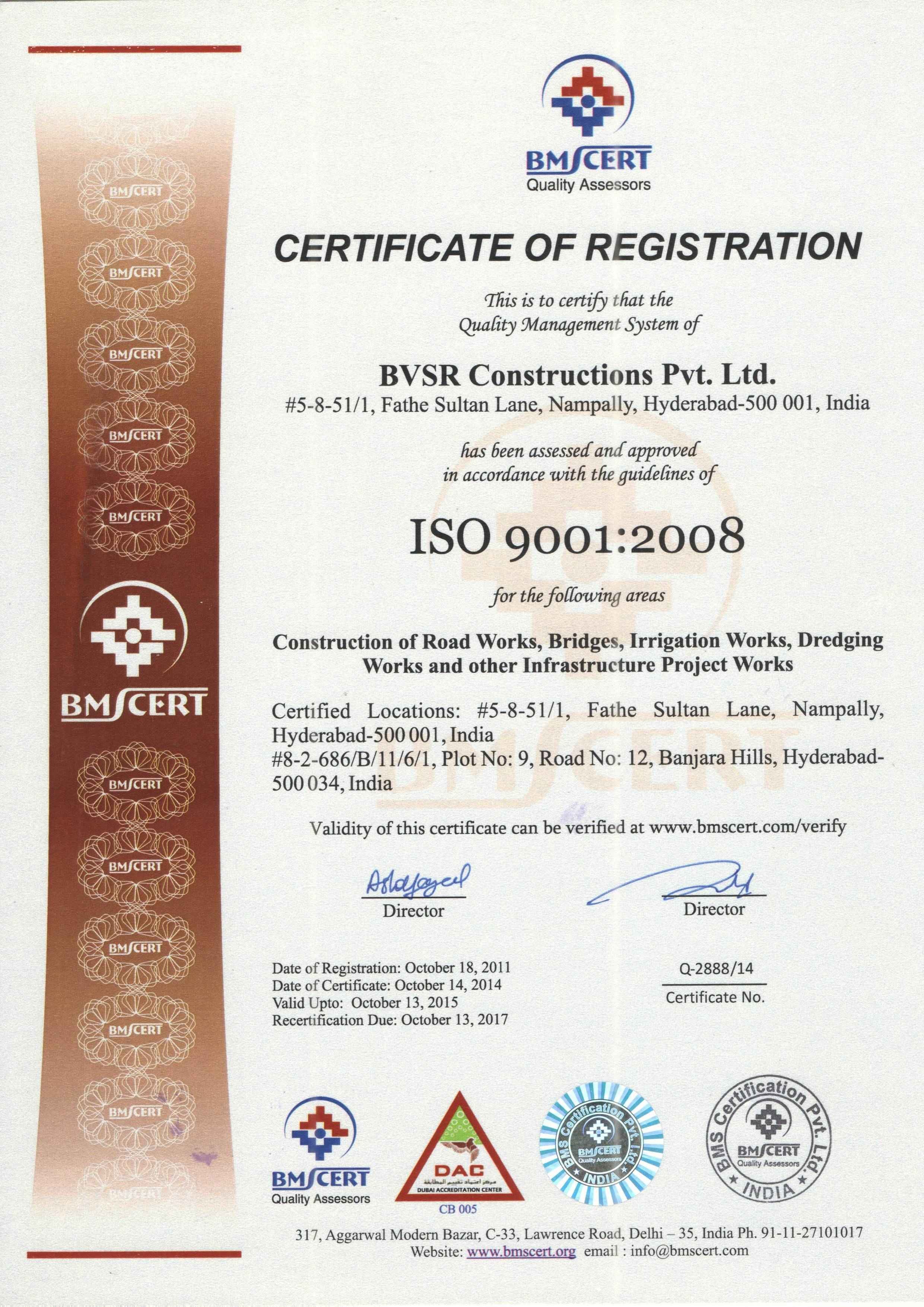BVSR Constructions Pvt. Ltd is one of the leading and fast growing ISO 9001-2008 Construction Company in India having established a strong reputation at National level in executing medium to large civil projects and in providing turnkey solutions for its valued clients. BVSRCPL’s cutting edge capabilities cover a wide range of Civil Engineering -Concept, Design, Construction and Commissioning on EPC and BOT modes. Highways, among Bridges, Earth Dams, Spillways and Aqueducts etc, remain our core competence. At BVSRCPL we combine financial soundness, technological competence, quality and safety oriented construction methodology, good resource planning and an efficient construction management. The Streamlined, cost-effective systems & processes have enabled the company to deliver projects within time and budget, adhering to strict quality control and safety measures. BVSRCPL has contributed to the many prized land marks of the Andhra Pradesh & Telangana - some of the exquisite Roads, ROBs, Earthen bunds, Canals and Spill ways having been executed by BVSRCPL. Notable projects also have been executed in other states which have earned laurels for the Company. BVSRCPL has PAN India operations; some of Infrastructure projects being handled by BVSRCPL are spread over states of Tamilnadu, Madhya Pradesh, Odisha, Sikkim and Karnataka. BVSRCPL is also adjudged in Andhra Pradesh as one of the best managed and a respected Company on various attributes of client delight.